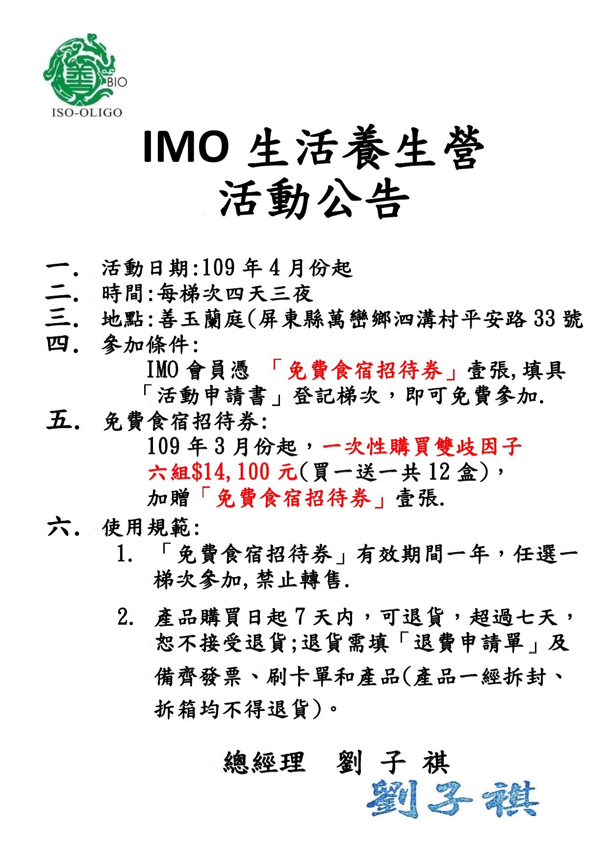 109年三月起 一次性購買雙歧因子六組 即可加贈“IMO生活養生營 四天三夜免費食宿招待券“乙張