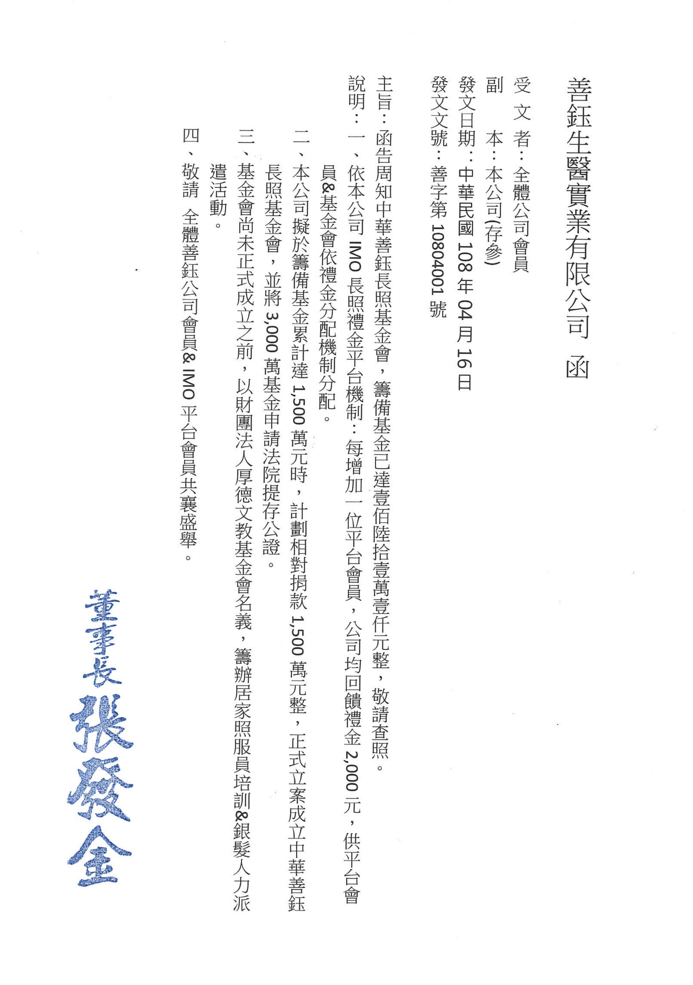 Read More中華善鈺長照基金會籌備基金已達NTD 1,611,000 本公司擬於籌備基金累計達NTD 15,000,000時 相對捐款等額基金 正式立案成立"中華善鈺長照基金會"